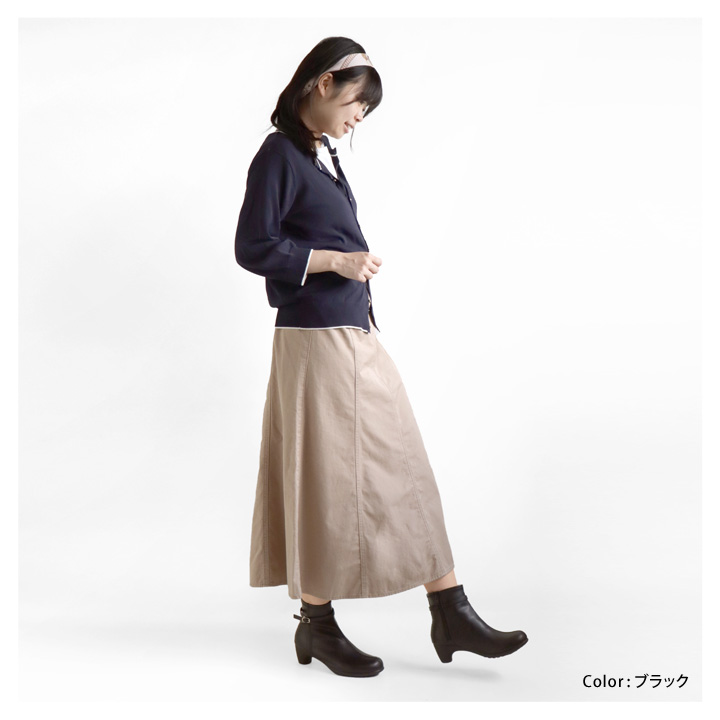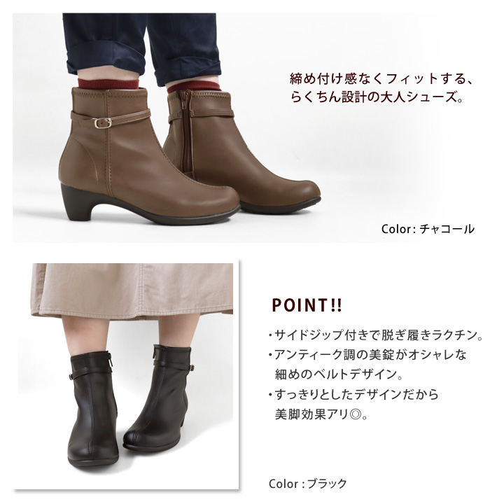 サイドジップ付きで脱ぎ履きしやすく、細身のシルエットで足元がきれいに見えるアイテムです。
