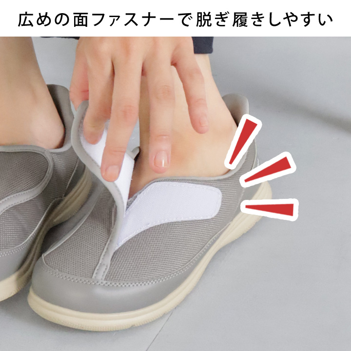 ガバっと開く履き口と調節幅が広い面ファスナーで、履く時のストレスが最小限に。