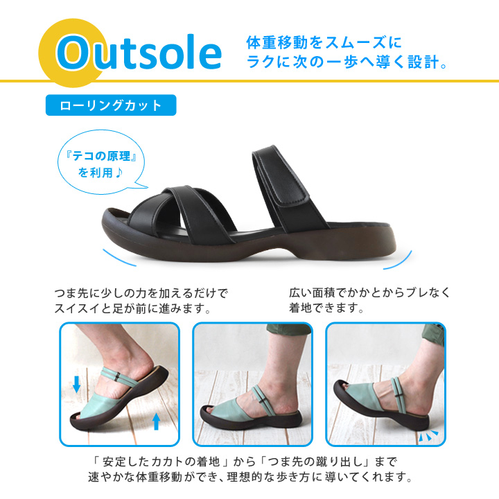 甲ベルトの面テープで調節できるから、甲が高い人も低い人も安心。