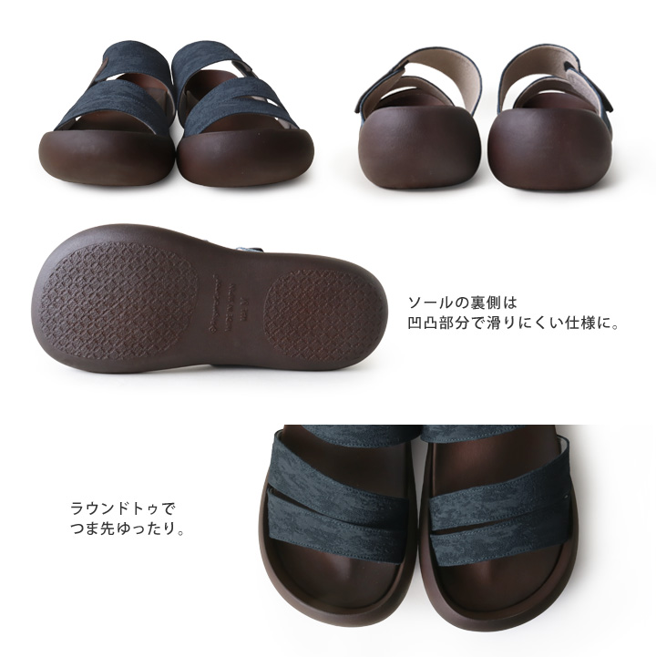 甲ベルトの面テープで調節できるので、自分の足に合わせた心地よいフィット感で履ける。
